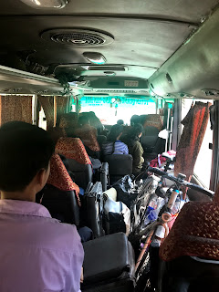 While I was resting at the top of my 2nd ascend, a local bus worked its way up the 20% incline. As I guessed that the road would keep going up and down during the last 23km of today’s ride as well, I decided to hitch a ride. I waved and the bus stopped. We hoisted the bike into the bus and I climbed over some Vietnamese to reach the backseat. And that’s how I ended up only cycling 45km today. On the one hand it feels a bit like quiting. On the other hand I think it’s never stupid to listen to your body. And I’m on holiday, so it should stay fun as well 🙂