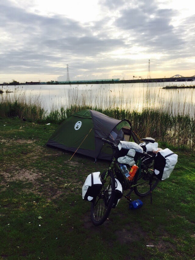 Vandaag de derde dag! De camping op Zeeburgereiland waar ik gister heb overnacht deed me heel erg denken aan de camping in het Bois du Boulogne in Parijs. Kleine veldjes, compleet volgepropt met een grote variatie aan verschillende tentjes. Het was dus even zoeken naar een plekje om mijn tentje neer te zetten. Uiteindelijk heb ik een mooi plekje gevonden aan de waterkant. Waar de camping bij Hindelopen een vredige familiecamping was, was de camping op Zeeburgereiland een ware samenkomst plaats voor jonge hipsters. Zo hip ben ik helemaal niet. Persoonlijk snap ik dan ook niet zo goed wat er precies zo leuk is aan het maximaal openzetten van het volume van je autostereo met alle deuren en de laadklep van je auto wijd open, terwijl twee tentjes verderop iemand anders met zijn gettoblaster probeert er met zijn eigen muziek overheen te komen. Voelde me er niet helemaal gelukkig, vooral omdat ik bang was dat mijn fiets bij wijze van een dronkemansgrap in het water zou verdwijnen.