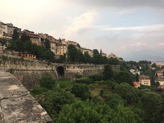 Zicht op de Citta Alta, met enorme stadsmuren.