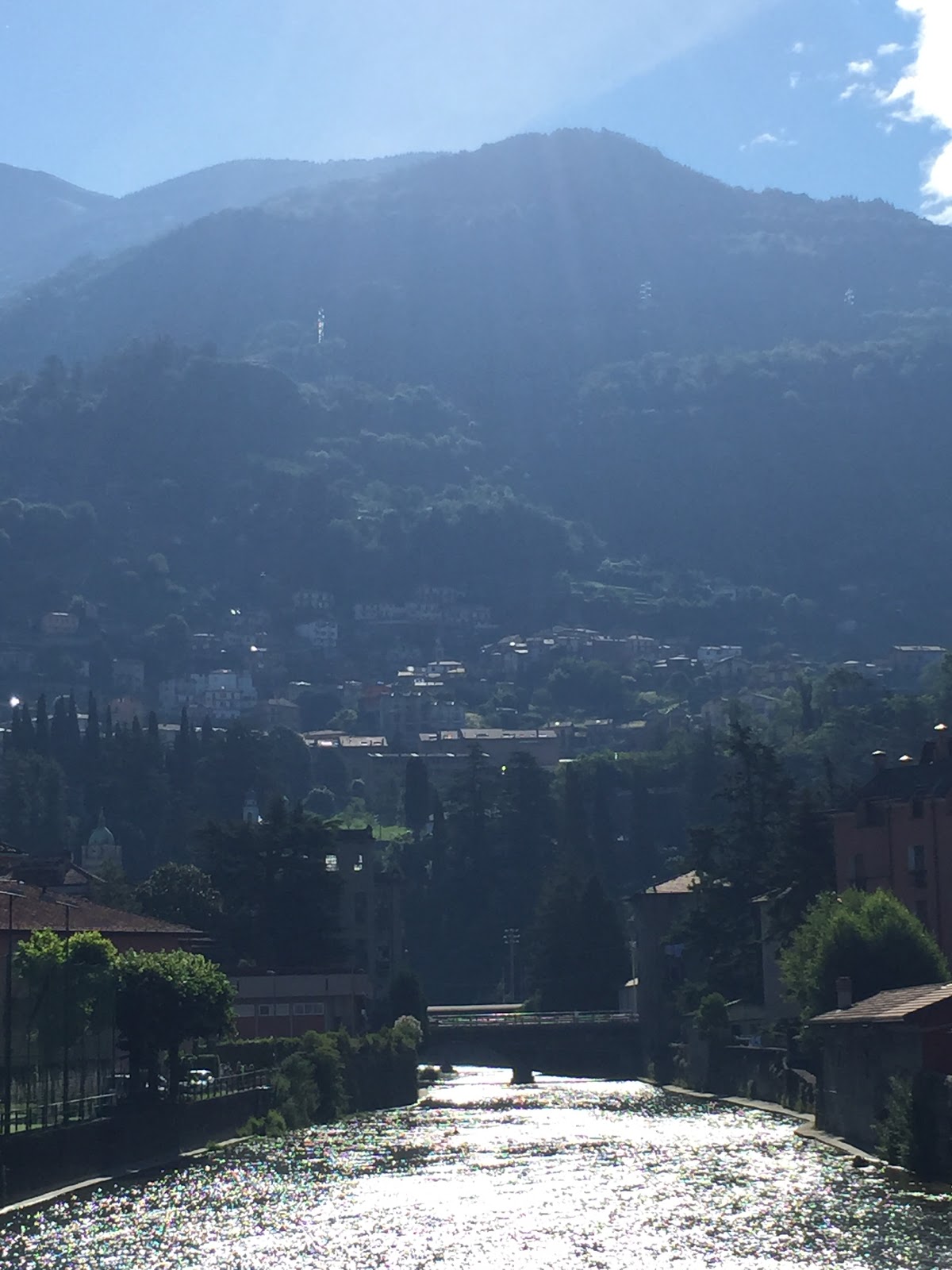 Op een bepaald moment is het meer op en gaat het meer over in een langzaam stromend riviertje. Over onwaarschijnlijke onverharde paadjes ben ik dit riviertje afgefietst, totdat ik de Alpen echt achter me heb gelaten. Vervolgens ook hier weer met een veerbootje overgezet naar de andere kant, om het laatste stuk naar Bergamo te fietsen. De natuur is ten zuiden van de Alpen echt veel weelderiger en her heerst echt een heel ander klimaat. Toch bijzonder dat zo’n bergketen dat kan veroorzaken.