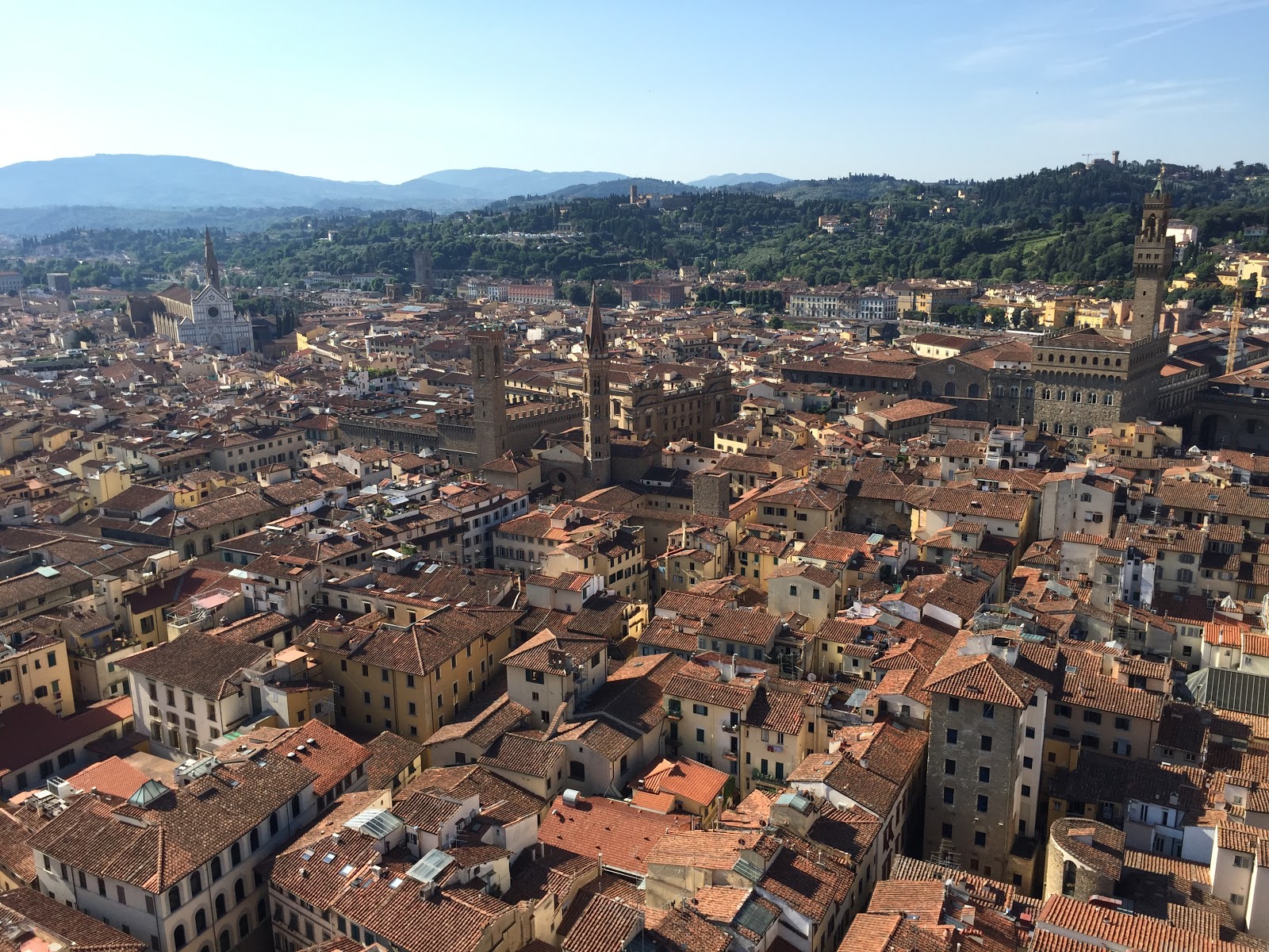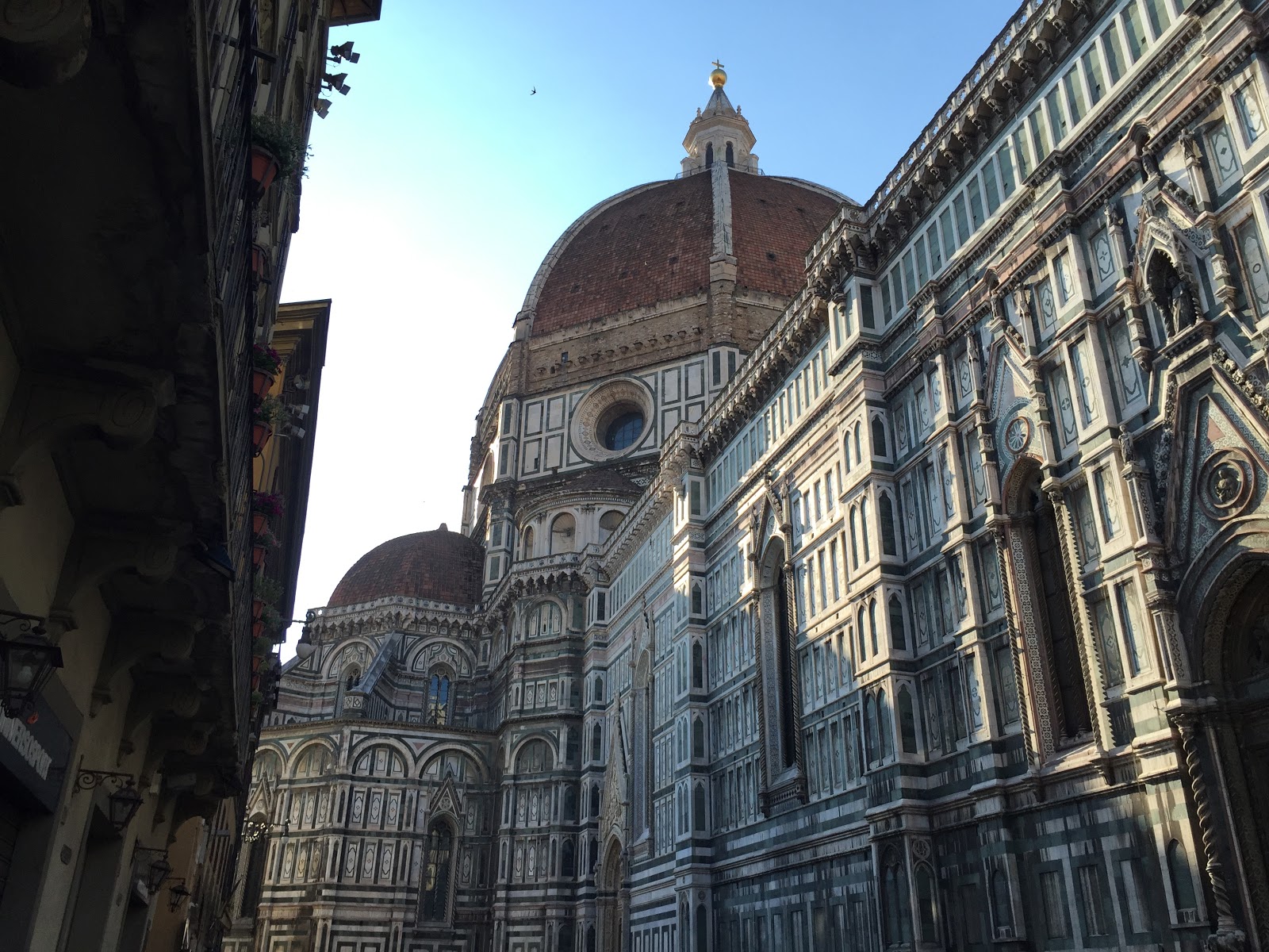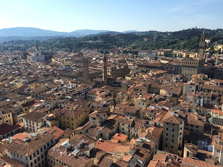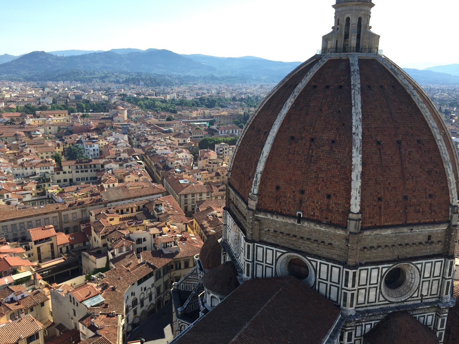 Mja en waarom gaan mensen naar Florence? Om de enorme koepel van de dom te bekijken natuurlijk. En dus was ik om 0800 ter plaatse en stond ik om 0830 bovenop de campanile om die enorme koepel eens goed te bekijken. 0830 en ik was doorweekt van het zweet door de beklimming van de beltoren. Ondanks dat ik de toren heel rustig beklommen heb was het om 0830 al zodanig warm dat het zweet ook bij minimale inspanning al in straaltjes van me afliep. Niks geen rustdag, noeste arbeid met als beloning een schitterend uitzicht over de stad en natuurlijk ook over de koepel. Hoewel de koepel stiekem zo groot nog niet is en ik hem eigenlijk gisteravond al wat aan de kleine kant vond. De koepels van de sint Pieter in Rome of de sint Paul in London zijn ruim groter, maar het bijzondere aan deze specifieke koepel is dat het hier in Florence voor het eerst weer gelukt is om een koepel van een dergelijke omvang te bouwen sinds we dat bij de val van het Romeinse rijk verleerd waren. Allemaal te danken aan ene ingenieuze Filippo Brunelleschi. Met zijn koepel vond de wedergeboorte van de klassieke architectuur plaats en verlieten we de donkere middeleeuwen en begon de Renaissance.