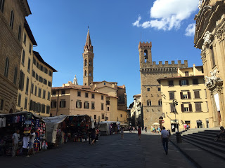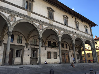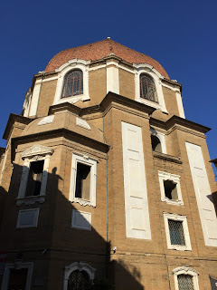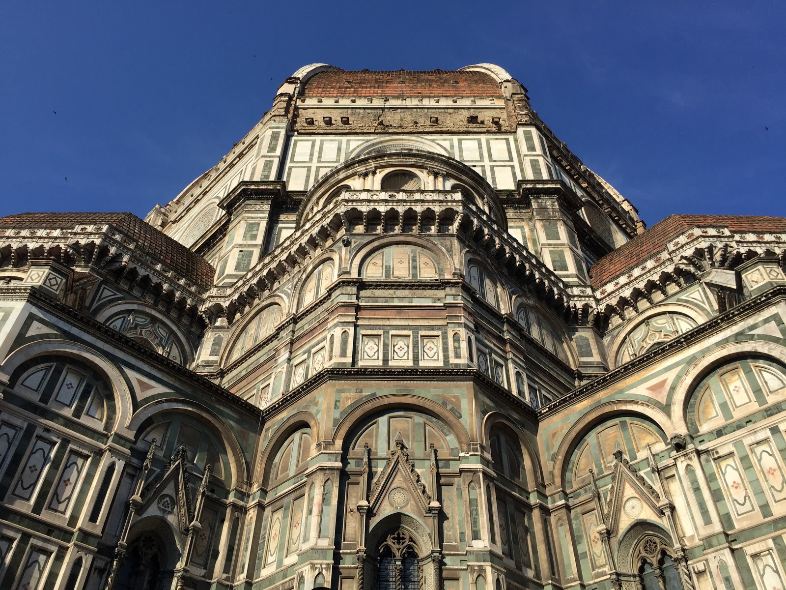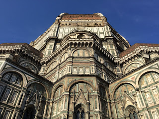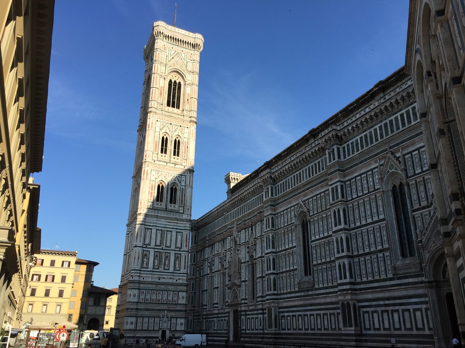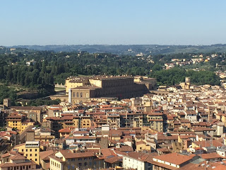 Mja en waarom gaan mensen naar Florence? Om de enorme koepel van de dom te bekijken natuurlijk. En dus was ik om 0800 ter plaatse en stond ik om 0830 bovenop de campanile om die enorme koepel eens goed te bekijken. 0830 en ik was doorweekt van het zweet door de beklimming van de beltoren. Ondanks dat ik de toren heel rustig beklommen heb was het om 0830 al zodanig warm dat het zweet ook bij minimale inspanning al in straaltjes van me afliep. Niks geen rustdag, noeste arbeid met als beloning een schitterend uitzicht over de stad en natuurlijk ook over de koepel. Hoewel de koepel stiekem zo groot nog niet is en ik hem eigenlijk gisteravond al wat aan de kleine kant vond. De koepels van de sint Pieter in Rome of de sint Paul in London zijn ruim groter, maar het bijzondere aan deze specifieke koepel is dat het hier in Florence voor het eerst weer gelukt is om een koepel van een dergelijke omvang te bouwen sinds we dat bij de val van het Romeinse rijk verleerd waren. Allemaal te danken aan ene ingenieuze Filippo Brunelleschi. Met zijn koepel vond de wedergeboorte van de klassieke architectuur plaats en verlieten we de donkere middeleeuwen en begon de Renaissance.