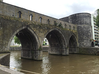 De Middeleeuwse stadspoort van Doornik, over de Schelde heen.
