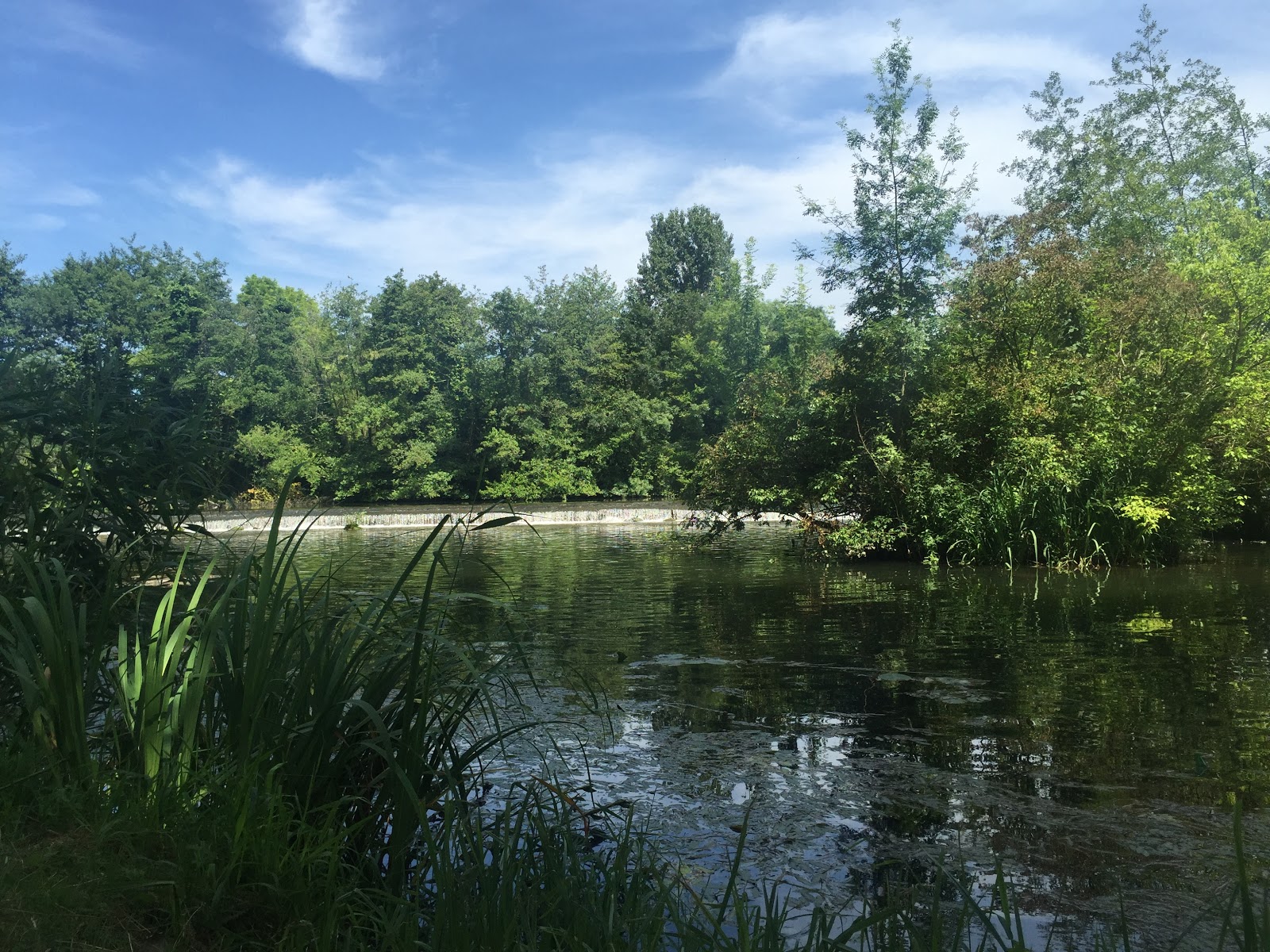 Om boven genoemde reden ben ik vanmiddag, na een luttele 75 kilometer op de fiets, gestrand bij mijn oorspronkelijk geplande camping in Saint Aulaye. En aan de camping een rivier waar ik mezelf heerlijk in heb laten vallen (of eigenlijk geleidelijk in heb laten zakken). En daarna heerlijk in het gras lezen, luieren, slapen en genieten van het geluid van een mini waterval. Vakantie!