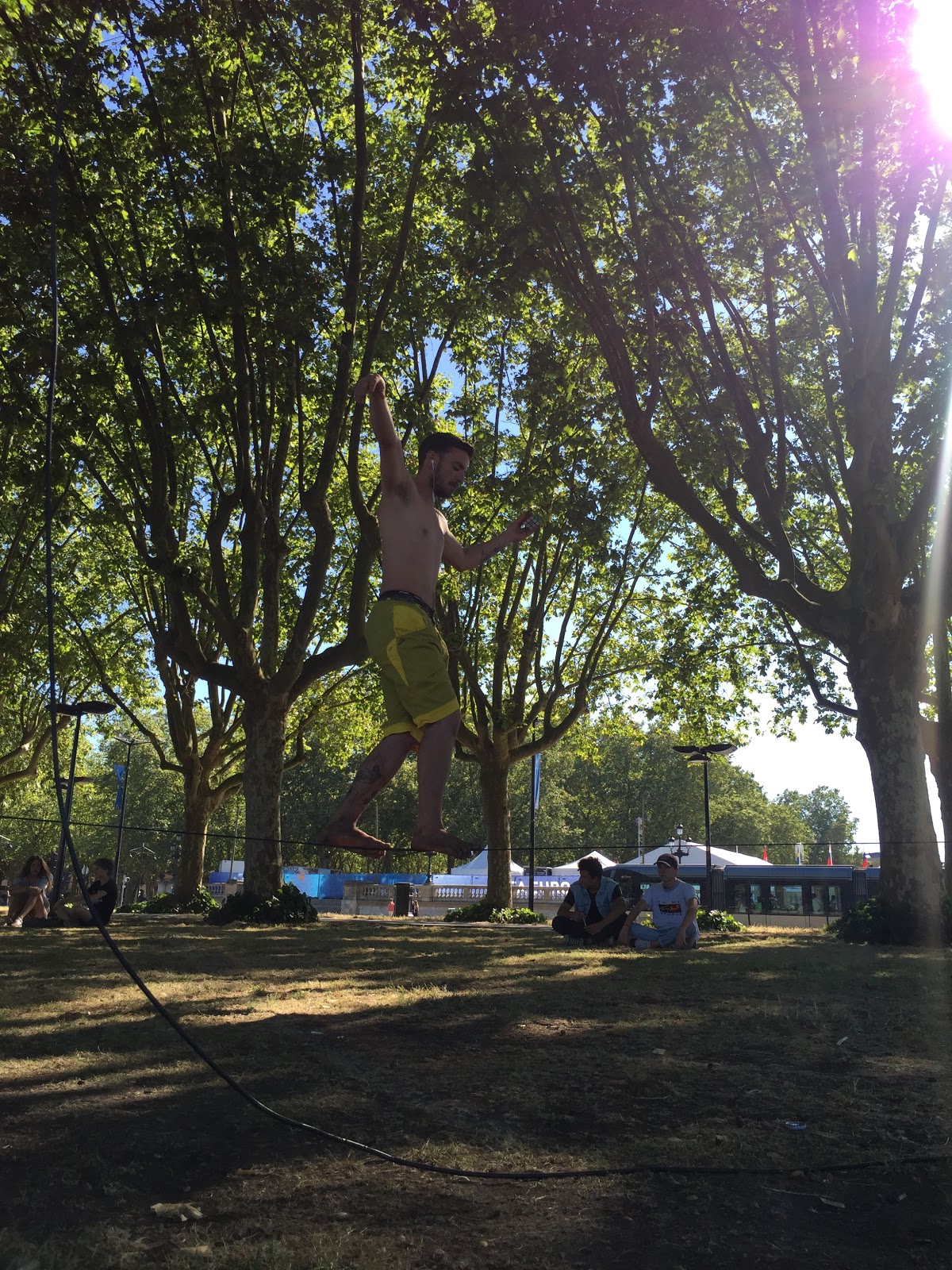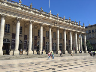 Het zal wel helpen dat het zaterdag is en dat het zonnetje weer zo mooi schijnt, maar Bordeaux is een fijn bruisende stad. Op het plein bij het Hotel de Ville waren meerdere bruiloften gaande waarbij luid getrommeld, gezongen, geknald en getoeterd werd. Op de pleinen zijn de terrasjes gezellig druk. In de parken wordt muziek gemaakt, gedanst, gekoortdanst, geluierd en worden spelletjes gespeeld. En op de Place de la Bourse rende jong en oud door een laagje van 2cm water dat door honderden kleine fonteintjes op de donkere natuursteen tegels sijpelde. En natuurlijk heb ik zelf ook even verkoeling gezocht tussen al die genietende mensen, om vervolgens nog even bij te komen tussen de ontspannen mensen in het park.