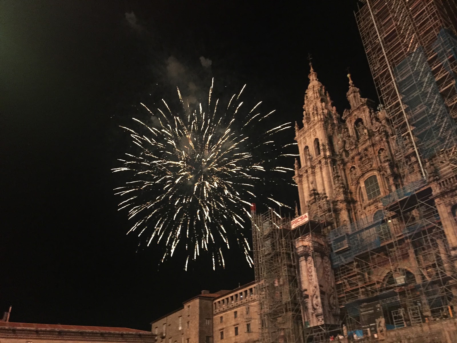 En toen was daar de laatste steile klim waarvan het routeboekje suggereert dat je er beter voor afstapt. Na al zo’n eind met de fiets te zijn gekomen was ik daar absoluut te goed voor en dus heb ik mezelf nog één laatste keer goed boos gemaakt en mezelf nog één keer de helling opgesjeesd. En dan is daar het einddoel vrijwel bereikt. De grote anticlimax. De laatste 500 meter naar de kathedraal was vol met dagjes mensen die geen stap voor je opzij doen en geen fluit geven om de maand die je nodig hebt gehad om dit punt te bereiken. De kathedraal zelf staat voor restauratiewerk van onder tot boven in de steigers en de opmaak van het Compestellaat werd gedaan door iemand die er maar weinig zin in leek te hebben. Het was een stille eigen overwinning, alleen gevierd door mij…