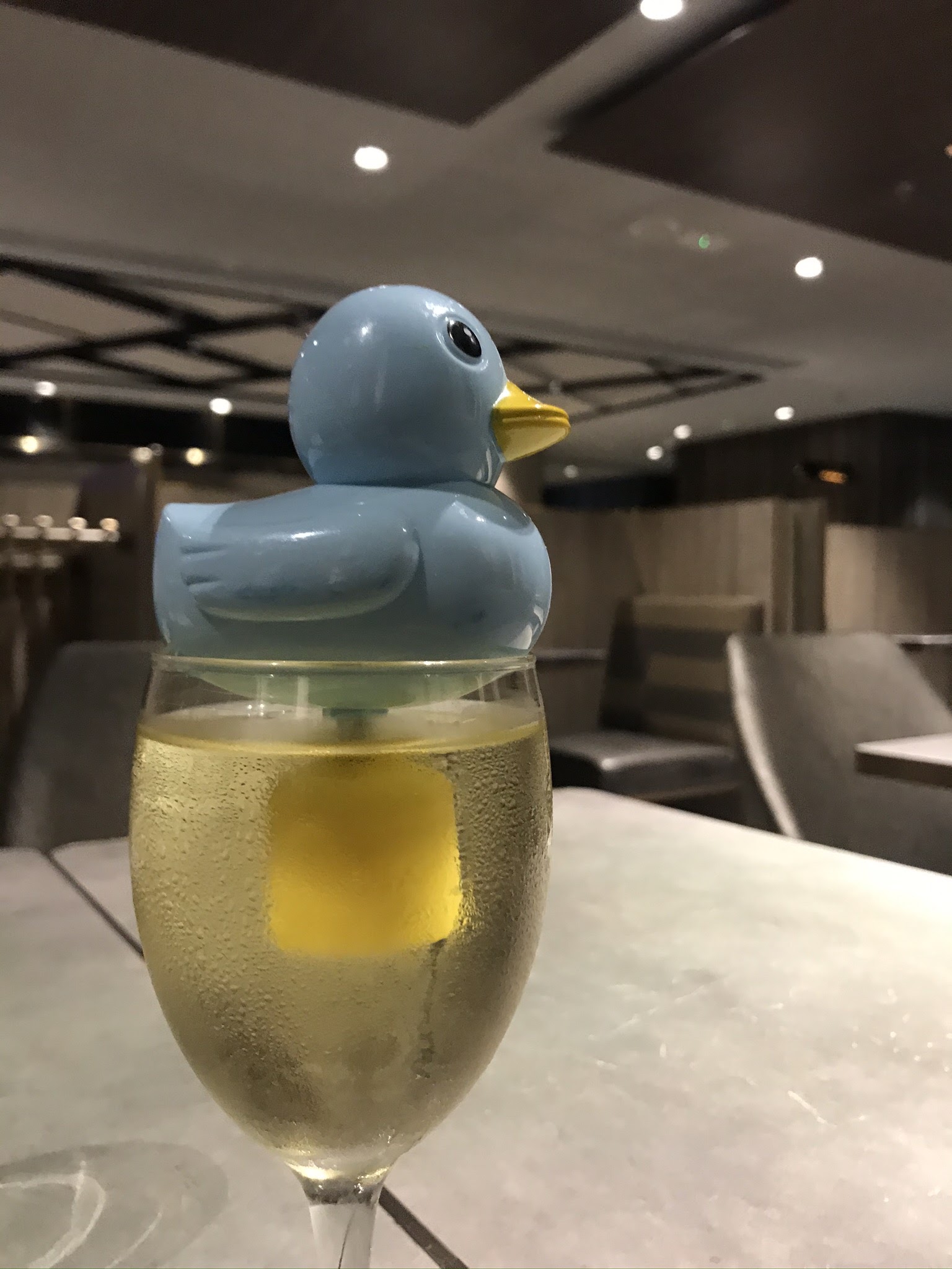 While waiting for the next flight Ducky told me that when he grows up he also wants to become a big bird and fly for an airline! Although he really feels quite said that a lot of big birds are not allowed to fly right now…. Inspired by the whole situation he really wanted to fly across the terminal while l was having my first Asian meal, but I told him it wouldn’t be a good idea. Maybe it was, I don’t know. I hated the thought of losing my quarantine buddy before quarantine actually started though…. In stead I let him have a swim in my wine. U fortunately the glass was not big enough for a proper swim, but he definitely got a bit tipsy! After that we boarded the flight and flew the last stretch to Taipei.