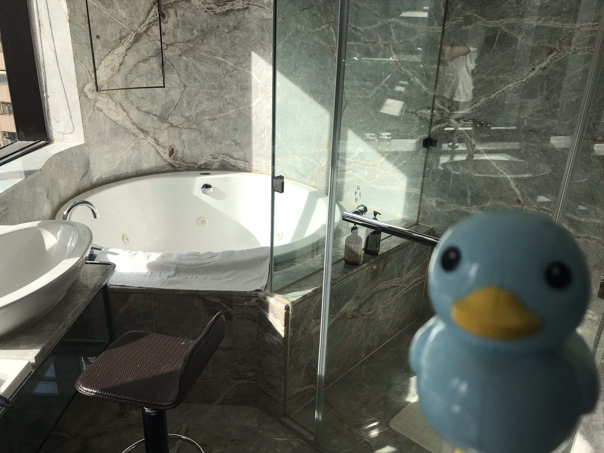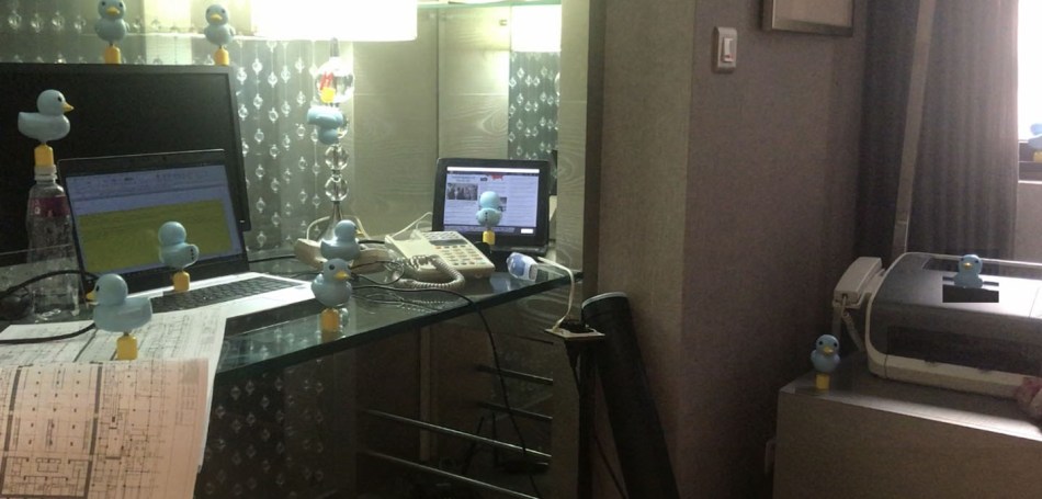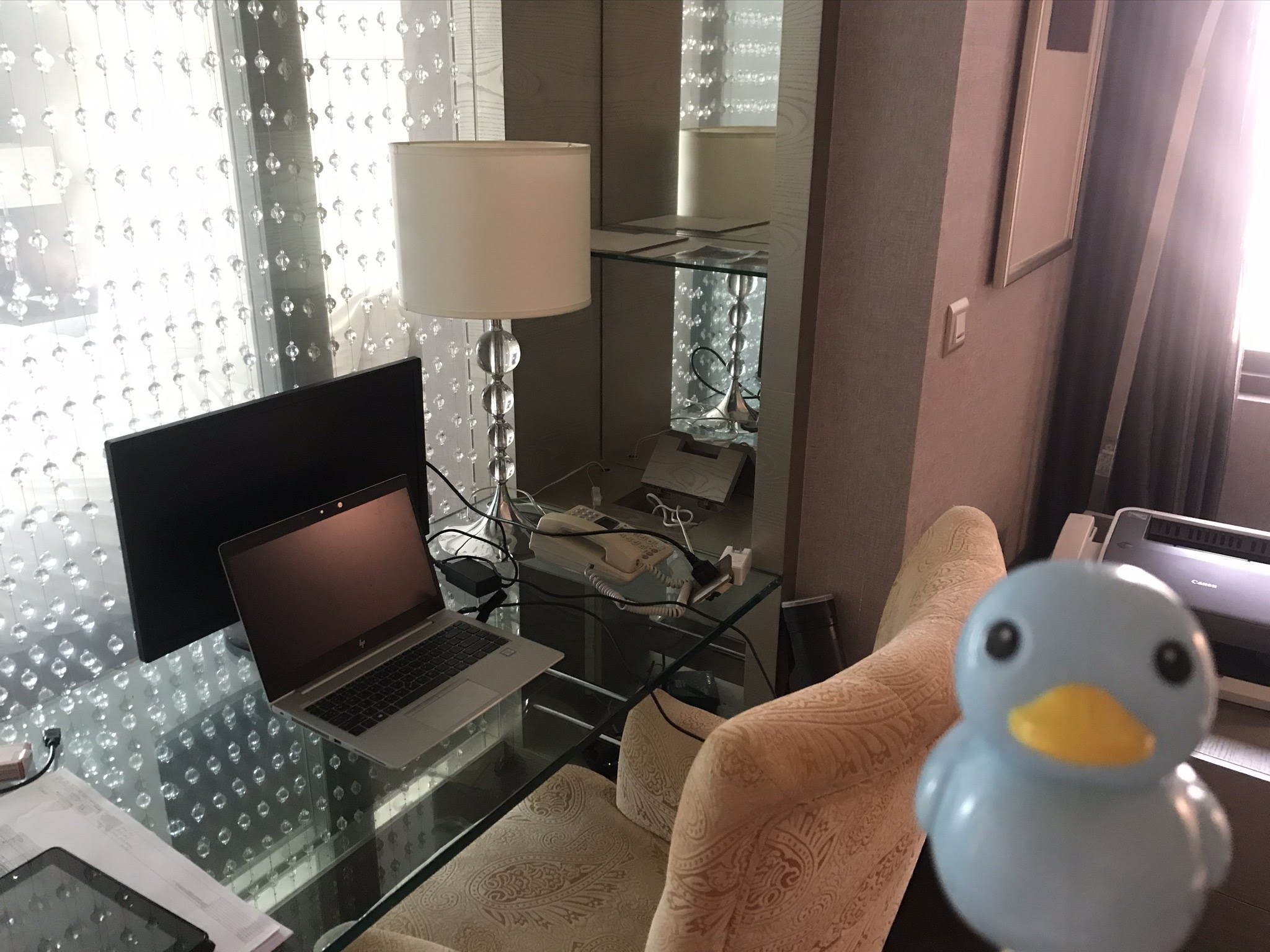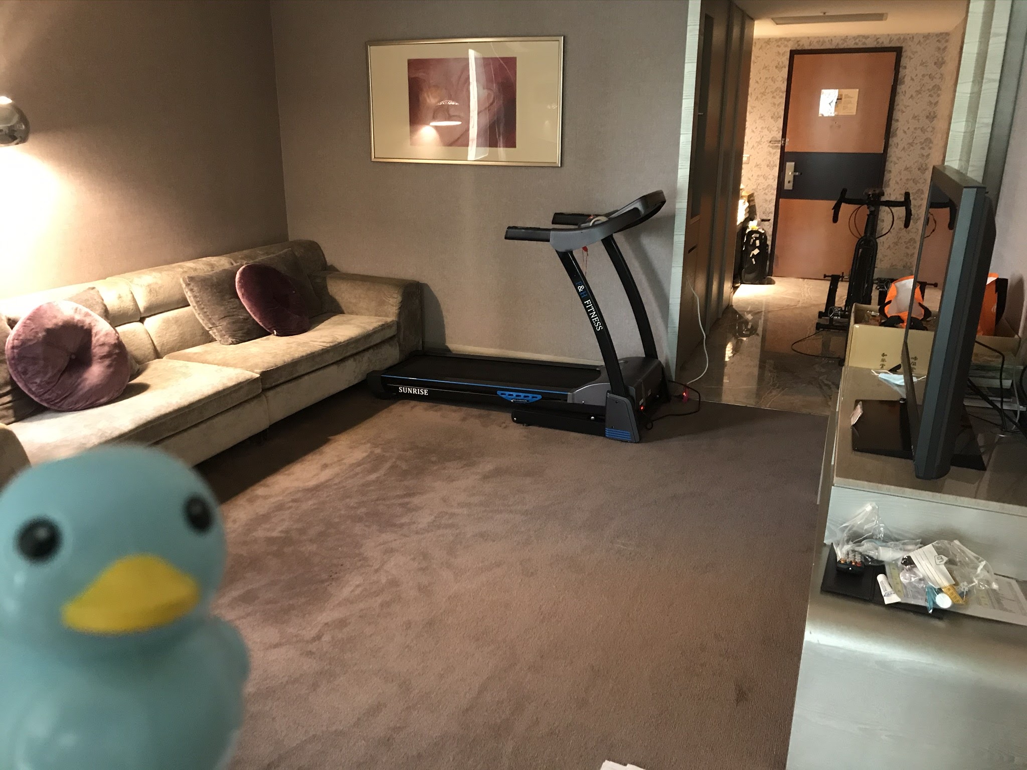 I brought a stand for my bike so I could use it while stationary, and my colleagues rented a treadmill for me, so I was able to keep up my running routine as well. And although the bath tub was quite big, it unfortunately was to small to keep up my swimming routine. Anyhow, Ducky said that I was not allowed to complain about the room in any case, because he said that it’s significantly bigger than the egg he had to spent the start of his life in…. Such wisdom….