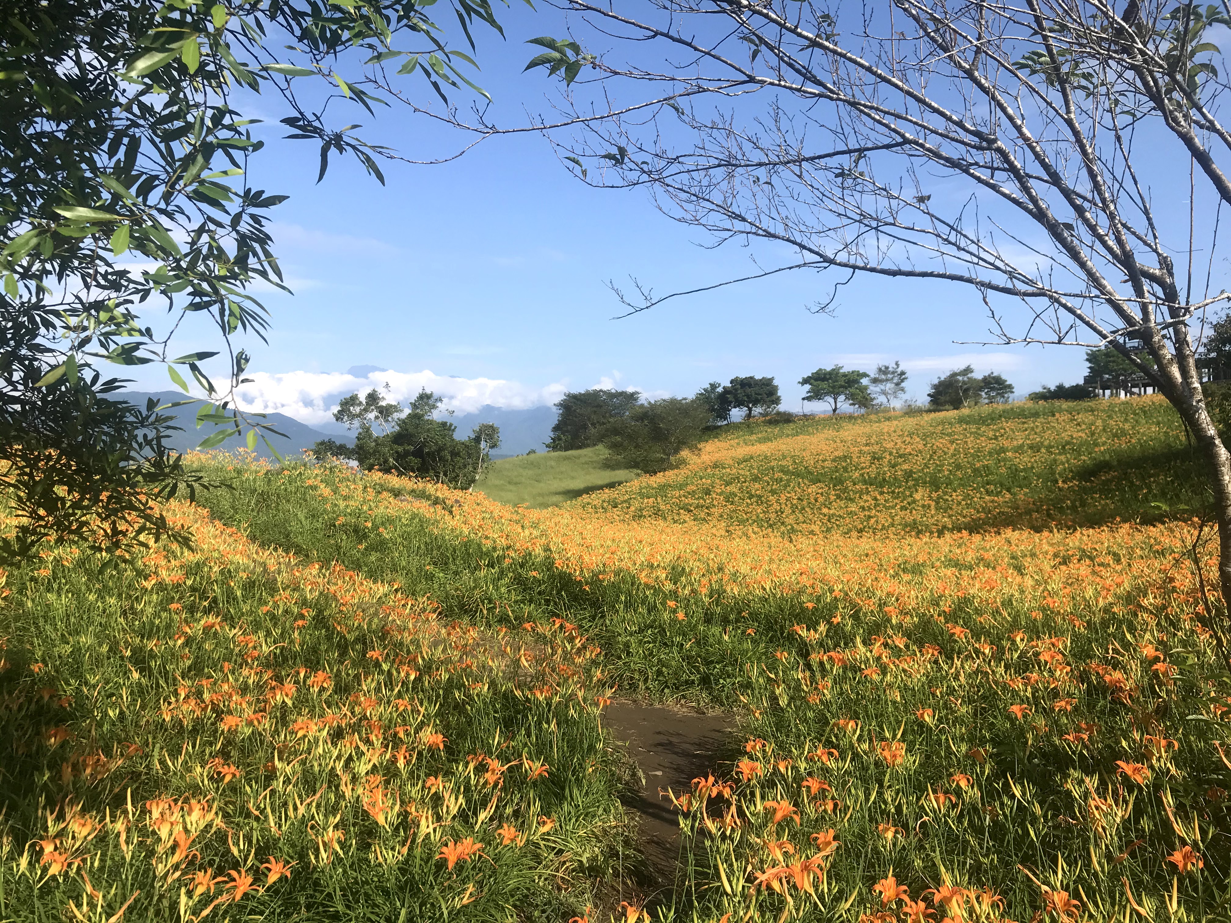 The first bit was quite steep but after that the 1100m ascent was quite manageable. I made my way through the clouds, towards the sun, after which I was treated to some impressive views over the rift valley and Taiwan’s central mountains. And then, towards the end of the climb, they were there! A sea of orange daylilies! The reason to come all the way here for a bike ride 🙂
