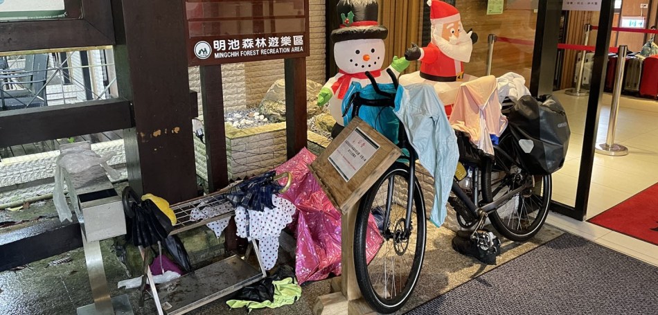 Today was supposed to be the last day of my trip, but rain, hills and low temperatures have made me cut my ride short today 😯 Taiwan has shown all it’s types of weather to me during the last two weeks, including clear blue skies with a blazing sun and 34 degree, storm force winds with curtains of rain, and only a 8 degree temperature and pouring rain during this morning’s ride. When I woke up it was only drizzling so I figured i’d just start riding, hoping that (based on the forecast) a little into today’s ride the weather might clear up a bit. First up was a 1000m climb. The legs felt good and scenery was great again. But climbing up, slowly temperatures decreased and my fingers and feet and legs were getting numb. Next up was some 60k of undulating descend, meaning downhill, followed by 150m bits of uphill. And it became very clear that the legs were not liking the uphill bits after cooling down on the downhill bits. Luckily I came across a hotel. I first informed whether they could help me arrange transport to where I needed to go, but they could only arrange transport to where I came from. So instead of hitching a ride, I opted to take a room for the night and finish today’s ride tomorrow. Always nice to have an extra day of holiday 😊 It’s still going to be a long wet day tomorrow though, but probably more manageable without having already already climbed a 1000m through the pouring rain. The pictures show my bike as drying rack for my cloths while making friends with Santa and Olaf, lunch and me trying to dry out some of my clothes, just to make them wet again tomorrow 😂