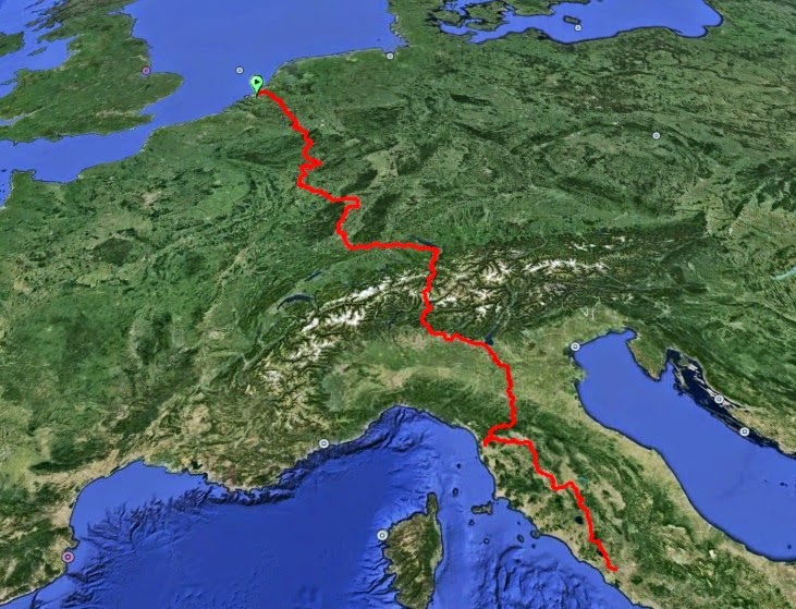 De door mij geplande route loopt vanaf Den Haag via Maastricht, Trier, Luxemburg (de stad), Metz, Saarburg, Straatsburg, Basel, de Bodensee, de Splügenpass, het Comomeer, Bergamo, het Gardameer, Mantova, Modena, Pisa, Florence, Siena en Orvieto naar Rome. Een afstand van vooralsnog een kleine 2500km, zo’n 3,5 x de afstand naar Parijs van vorige zomer. Met name het bezoeken van Steden als Trier, Luxemburg, Metz, Straatsburg en Pisa zorgt voor extra kilometers. Toch zijn dit steden waar ik graag een kijkje ga nemen omdat de kans klein is dat ik er ooit nog eens in de buurt kom.