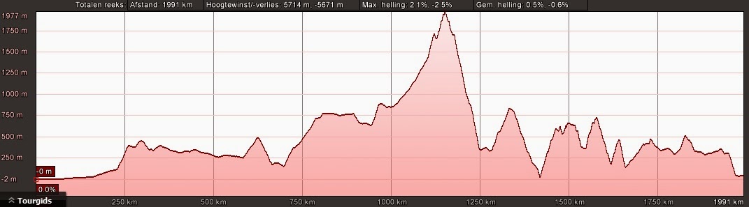 Er zit redelijk wat hoogteverloop in het gekozen traject. Het hierboven getoonde hoogteprofiel laat mooi zien dat de aanloop vanuit Den Haag naar Maastricht nog mooi vlak is. Vanaf Maastricht begint het eerste reliëf in de vorm van de Ardennen, welke worden afgelost door de Vogezen. Daarna volgen de Alpen met als summum de Splügenpass. Middels deze rustige pas worden in een etappe van zo’n 60 km de Alpen overgestoken. Na de Alpen volgen de Povlakte (deze is niet heel zichtbaar in het hierboven getoonde profiel), de naar het schijnt venijnige Apennijnen, de heuvels van Toscane en de heuvels van Umbrië.